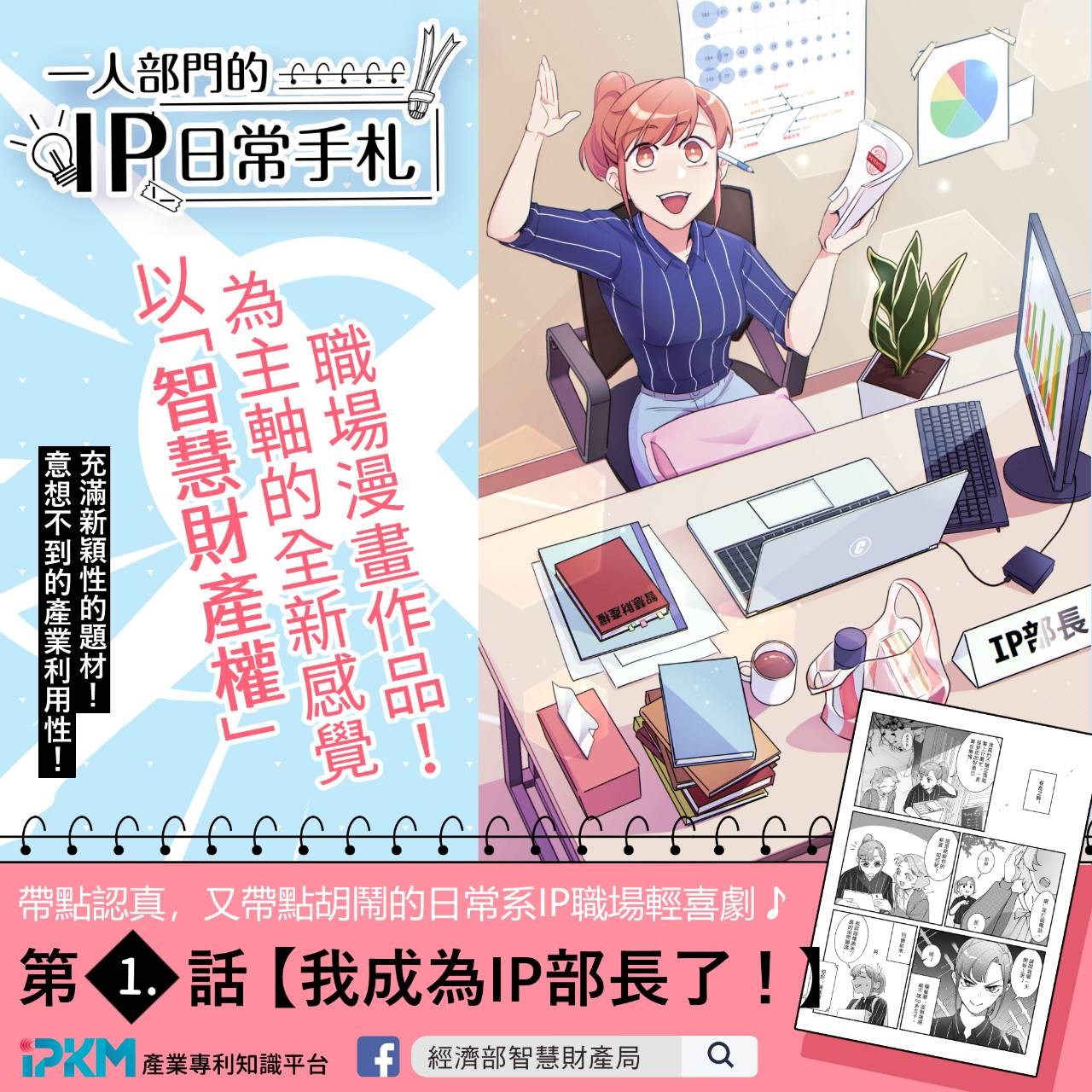 《一人部門的IP日常手札》現於智慧財產局IPKM平台連載中,並開放各界下載分享。欲追蹤漫畫連載消息,敬請關注IPKM平台以及智慧財產局官方FB粉絲團。